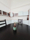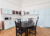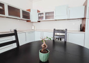 Kuchyňa je prepojená s obývacou izbou cez priestranný jedálenský stôl so stoličkami.