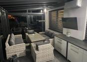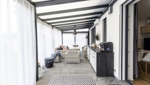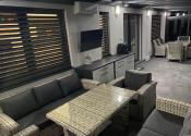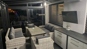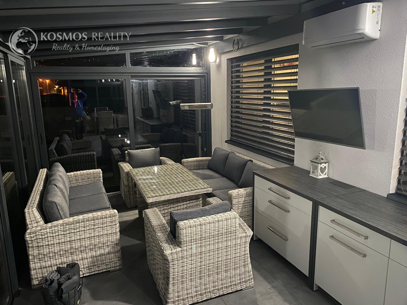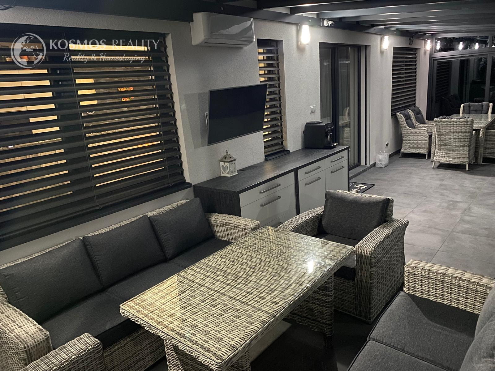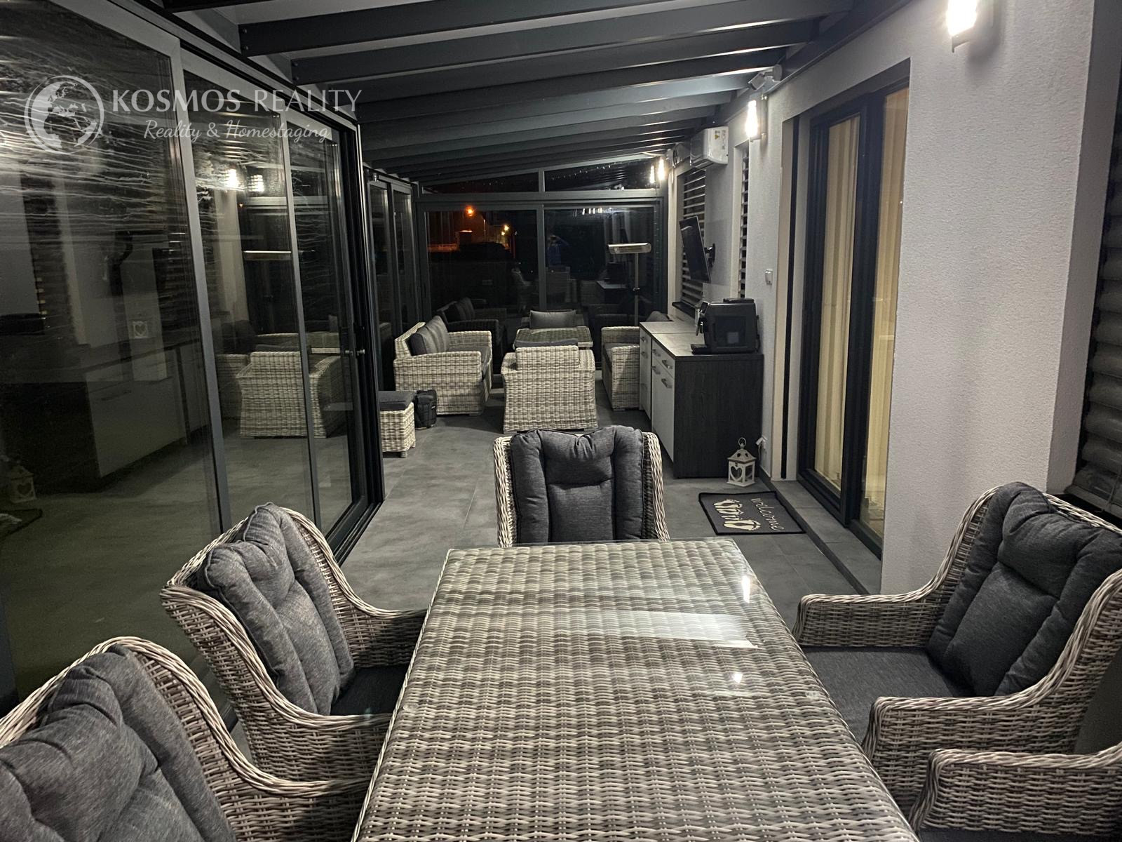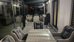 Špecifikum domu: pri vtupe do domu sa nachádza priestranná chodba z ktorej sa dostaneme do srcda domu - obývačky, ktorá je prepojená s jedálňou a kuchyňou. Z kuchyne je samostatný vstup do špajze. Z obývačky sa dostanete na priestrannú presklenenú terasu o rozlohe 40m2, ktorá slúži aj ako "druhá" obývacia izba. Na terase je vykurovanie riešené klimatizáciou. Ďalej sa z obývačky dostanete do 3 samostatných izieb z toho v spálni sa nachádza aj súkromný šatník. Dom disponuje jednou kúpeľňou a jednou samostatnou toaletou. V cene je všetok zastavaný nábytok (zbytok je o dohode).